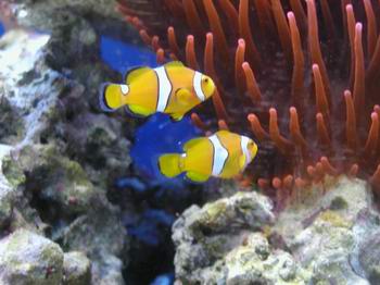 percula Echter Clownfisch Nemo Die beiden Nachzuchten, wobei noch nicht sicher ist ob es sich nicht um ocellaris handelt, sind schon am nächsten Tag in die Anemone eingezogen. Diese wird nicht mal zum fressen richtig verlassen |